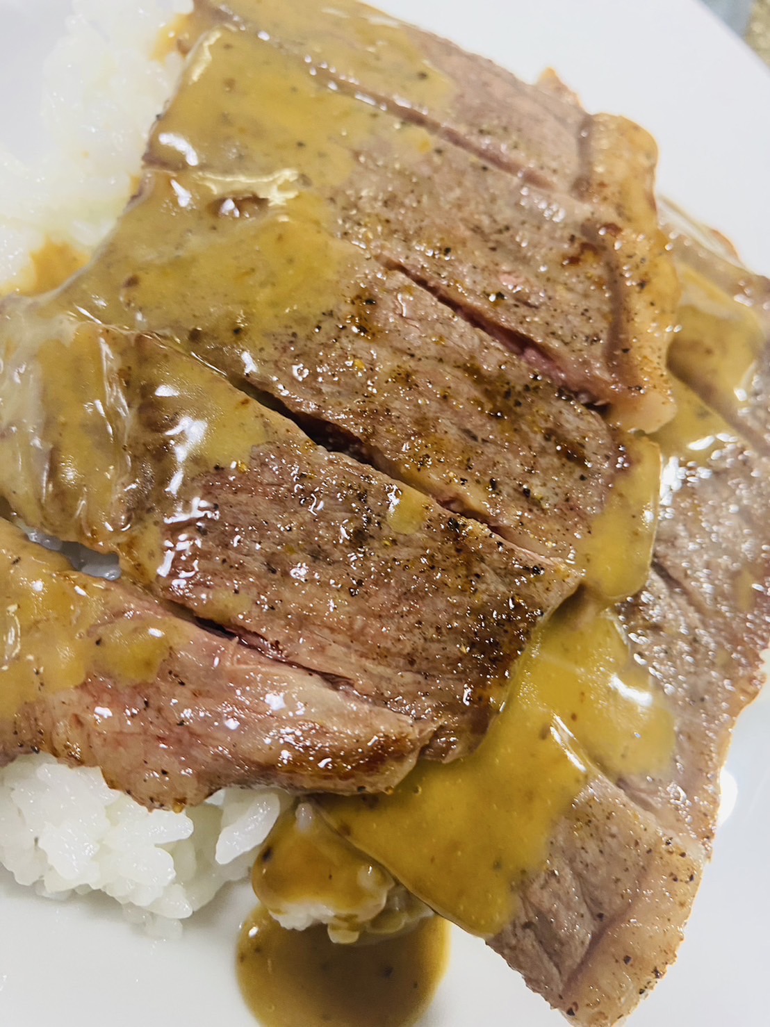 峠下牛サーロインステーキ丼は広島が誇る峠下牛を贅沢に使用。柔らかくジューシーなステーキをトリュフクリームソースで仕上げた逸品。