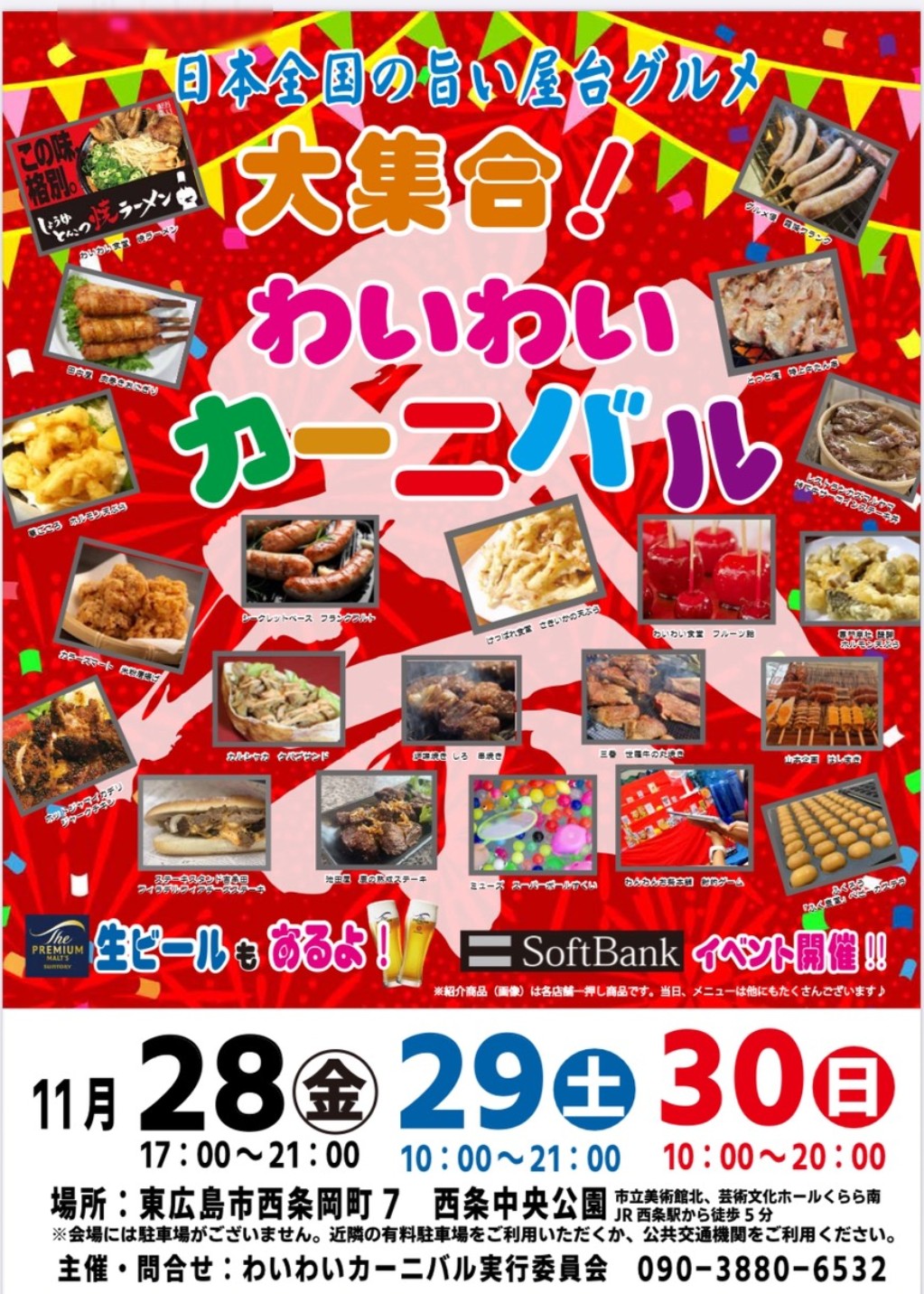 お勧めのイベントをご紹介します。東広島市西条中央公園で開催中の「わいわいカーニバル」は、日本全国の屋台グルメが集まる食の祭典です。
