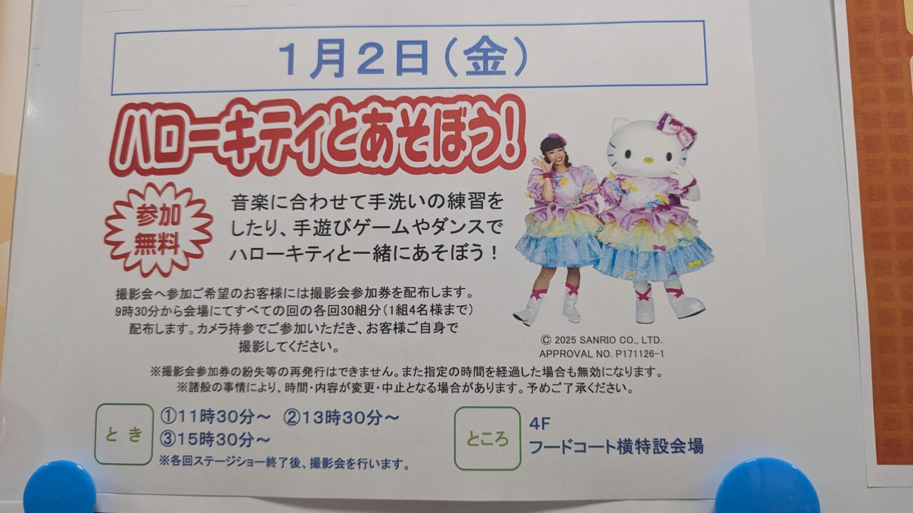 2026年1月2日にはハローキティとあそぼう、というイベントが開催予定。参加無料で気軽に参加できておすすめです。音楽に合わせて手洗いの練習をしたり、手遊びゲームやダンスでハローキティと遊んでみませんか? 撮影会へ参加希望のお客様には撮影会参加券を財布するそうです。詳細はチラシをご覧ください。