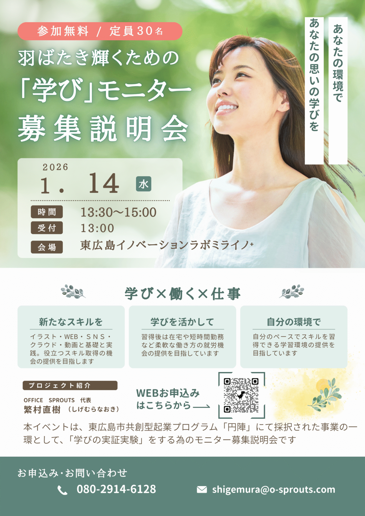 東広島市において、個人のスキル習得と地域事業者の課題解決を支援する2つの無料モニター説明会が開催されます。本取り組みは、東広島市の共創型起業プログラム「円陣」に採択されたプロジェクトの一環として、OFFICE SPROUTS代表・繁村直樹氏が主催するものです。地域の人材育成と事業支援を結びつける新たな試みとして注目されています。
