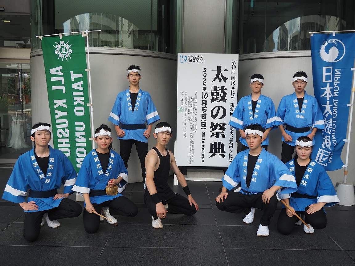 養訓太鼓は今年で創部26年を迎え、現在8名の部員が日々の稽古に励んでいます。校内行事をはじめ、地域の祭りやイベント、福祉施設での演奏など、年間約30回にわたり幅広い場で演奏を披露してきました。力強い響きと一体感のある演奏は地域でも高く評価され、地元文化を支える存在として親しまれています。