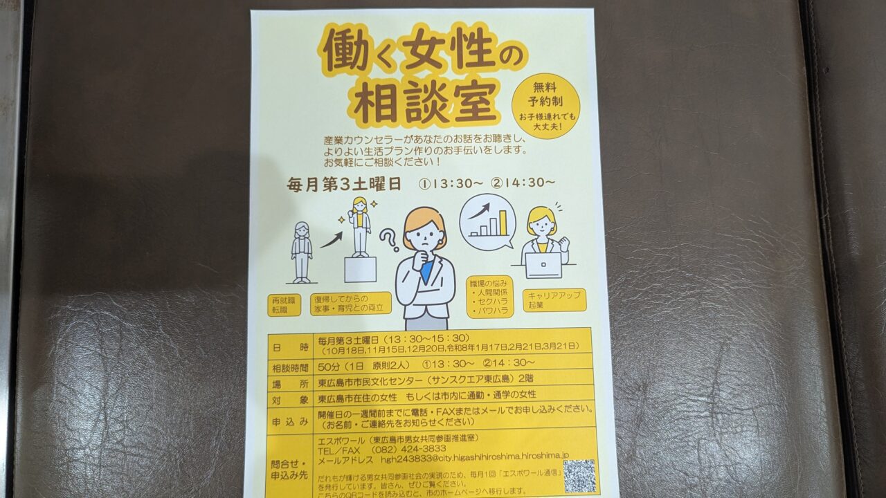 おすすめの東広島市の情報をご紹介します。東広島市の女性支援拠点「エスポワール」では、働く女性の悩みに寄り添う「働く女性の相談室」を開設しています。職場での不安やキャリアの方向性、転職活動の進め方など、幅広い相談に対応しており、地域の女性たちから頼れる存在として注目を集めています。