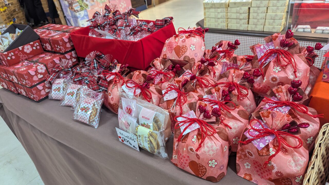 店頭にはバレンタインプレゼントにもぴったりな可愛いハートモチーフのお菓子の詰め合わせも販売されていました。老若男女問わずちょっとした御礼の気持ちやプレゼントにもおすすめです。