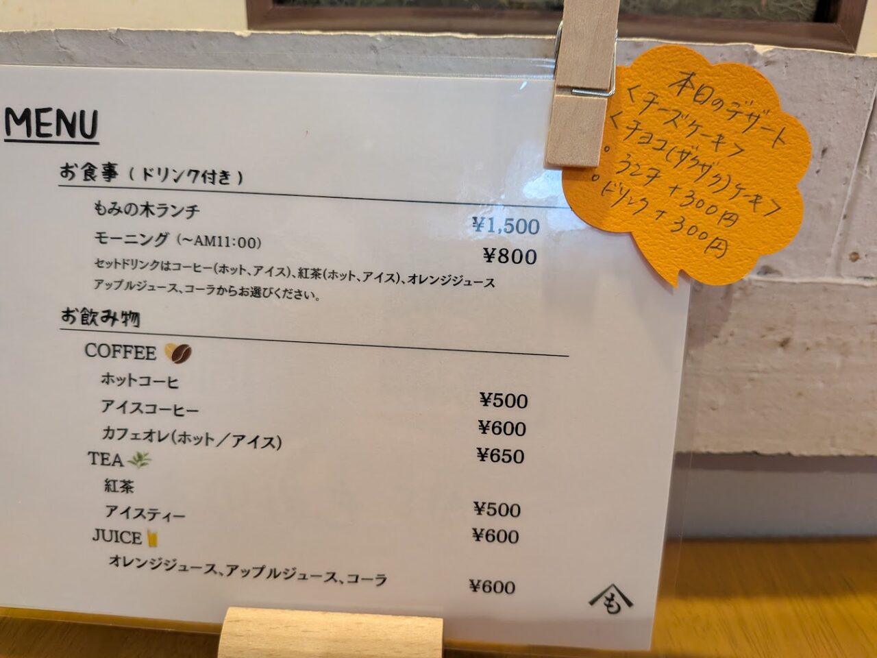 席のメニューの横に何かポップが貼ってあります。なんと、デザートが+300円で注文できるようです。しかも、2種類のケーキから選べるようです。