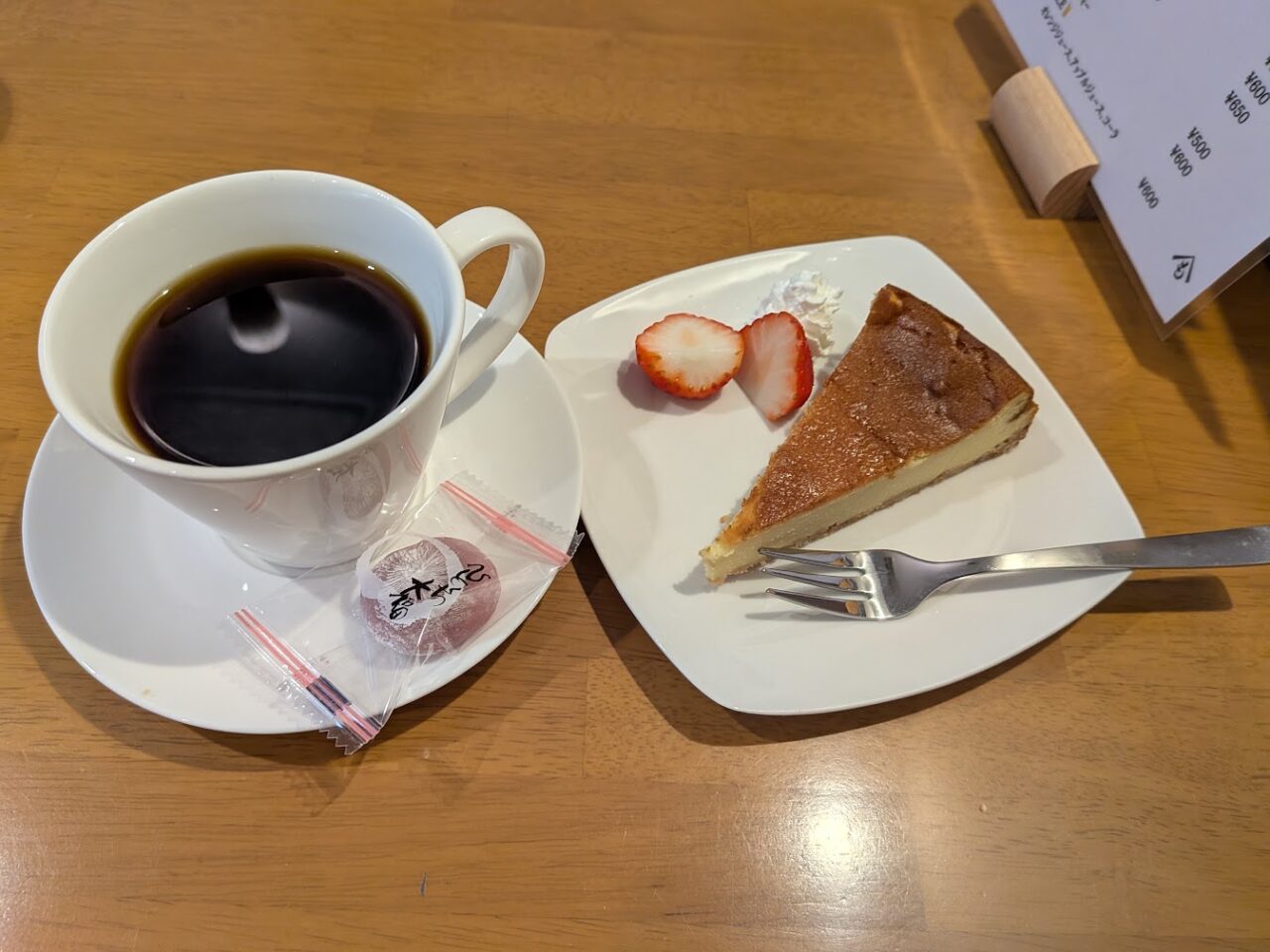 常連のお客さんにも人気だというチーズケーキにしました。いちごとホイップクリームも添えられています。伺った日はひな祭りということもあり、サービスでひとくち大福がコーヒーに添えられていました。チーズケーキはしっかりした食感ながらも、さっぱりしていて食べやすく、コーヒーとの相性も良かったです。